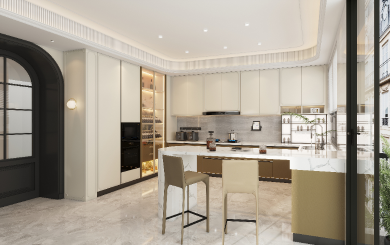 “烹"然心動的廚房美學,融入法式經典特色,感受煙火烹飪的慢時光。開放式餐廚,L型櫥柜,煙火氣、精致感,樣樣不落下。地柜延伸出一個輕盈的小吧臺,可以一邊品飲小酌,一邊等待料理煮好端上桌,非常浪漫的享受~
