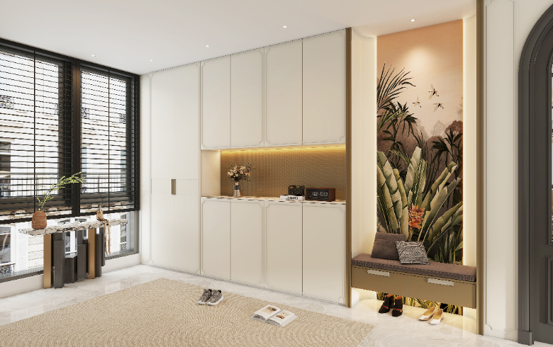 古典的優雅氣場,融入自然的生機,靜待時光歲月靜好。入戶柜由高柜和懸浮柜組成,足夠放下一家人的鞋子,還可以收納家政雜物。