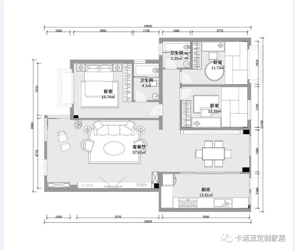 首先,將廚房擴大改成玻璃推門增加自然光,其次利用窄墻做對稱式入墻多功能餐邊柜,