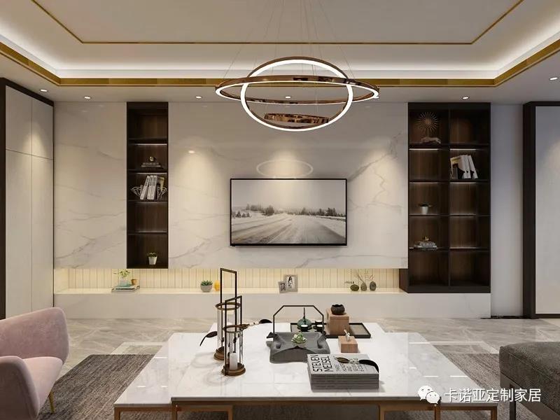 客廳選用偏北歐風的裝飾元素,簡約系漢白玉讓墻面更加簡潔大氣。沙發靠枕和地毯等布藝品在白灰的大色調中,加入跳躍的粉紅做點綴,活潑亮眼。開放格入墻式電視柜造型簡潔,和一旁的黑色木門相互呼應。電視機下面的鏤空設計,擺放藝術飾品,墻內燈帶設計,讓極簡空間明亮而溫暖