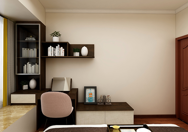 主臥空間的設計考慮到女主人平常喜歡閱讀,所以有在墻上做一個儲藏書柜,裝飾柜跟書桌的搭配,既是化妝臺又是小書桌,小戶型房間的設計真是一平米都不浪費。
