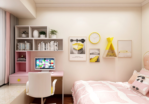 小朋友的房間比較明亮,童趣十足,水天藍和公主粉的設計再搭配明亮黃,瞬間輕快明亮,功課區和休閑區的設計,書桌功課做完立馬可以在休閑區玩耍,一房多用,小朋友們表示很喜歡自己的房間。