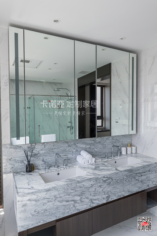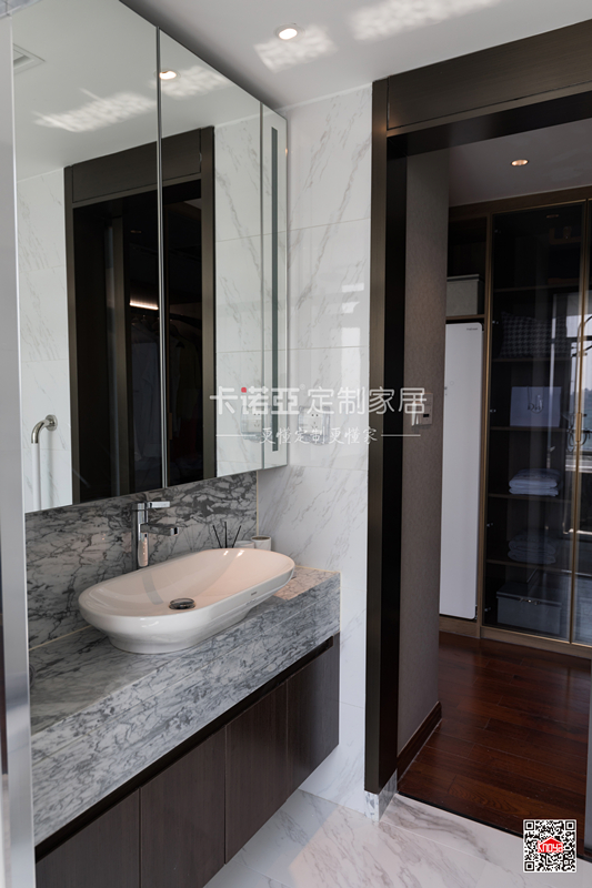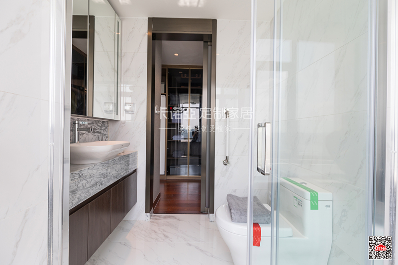 深色浴室柜體點(diǎn)睛,加上大面積玻璃的使用,衛(wèi)生間大氣明亮,空間通透開(kāi)闊。