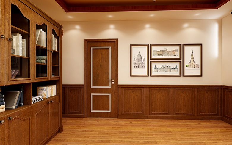 墻裙式護(hù)墻系統(tǒng)與免漆門、書柜、木地板同色搭配,空間一體性極強(qiáng),低調(diào)奢華,演繹新一代美式經(jīng)典的形態(tài)。