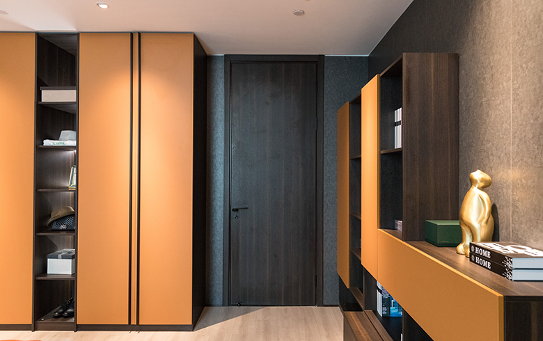 臥室門的顏色選擇,注重與整體家具相搭配,同時與室內的墻面顏色形成一定的反差,讓臥室顯得更加有層次。為了改變深色調的沉悶感,地面采用淺色木紋的木地板,衣柜等臥室家具的門板采用橙黃色,點亮了空間的活力,營造沉穩中帶有溫馨的氣氛。