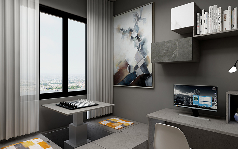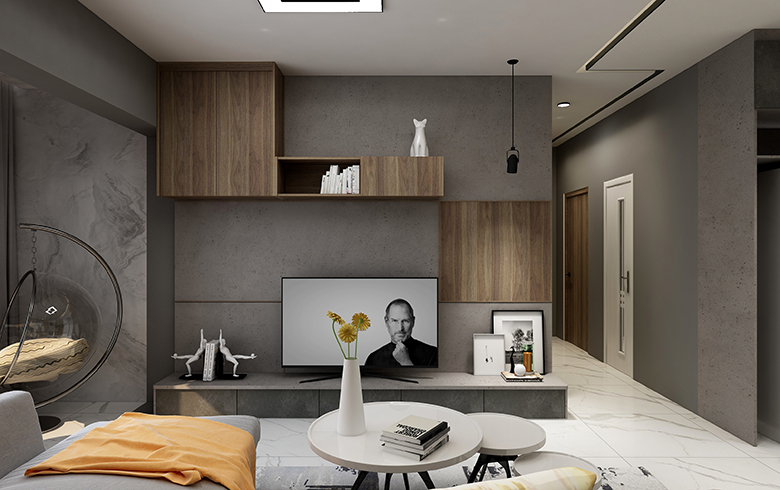 以黑白灰為主體色,的極簡風格家居設計,配上一部分深色木紋,緩和空間色調。凸顯出簡約而不簡單的現代簡約風格設計。