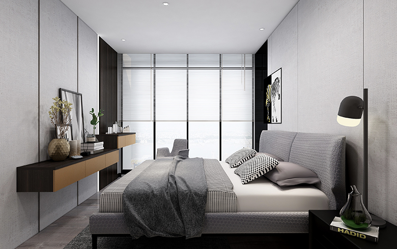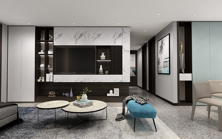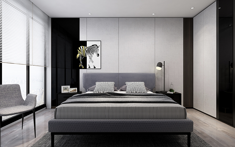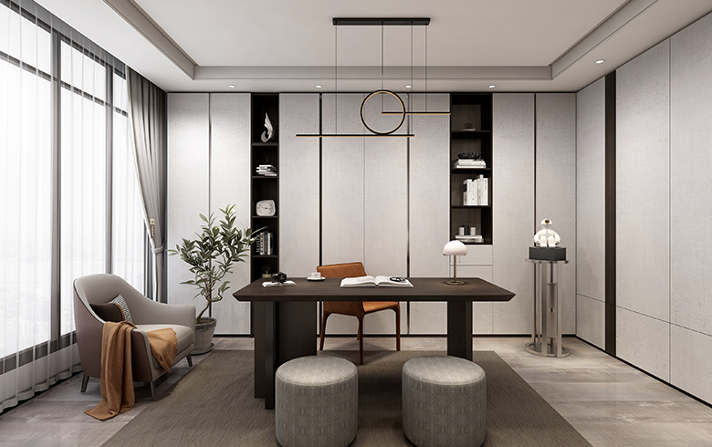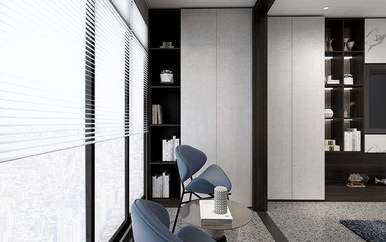 該方案為極簡系列,現代風格。本方案設計靈感來源于鴉頭棕雀的鳥巢,整體空間以木紋色為主,采用淡藍色為輔助色作為點綴。空間戶型面積約為103m2,大致分為客餐廳、陽臺、廚房、衛生間、主臥、次臥以及書房。動靜分區,互不干擾。整個客餐廳色調有淺灰、黑色兩個色調,視覺上顯得統一。廚房設計為L型。主臥床頭背景設計兩層,第一層與柜體顏色相呼應;第二層與柜門顏色呼應。顏色統一,層次與立體感強;通過橙色調進行點綴,增加空間的靈動性。次臥的主色調是淺灰色,是深受現代主流的配色,給人一種親近的感覺。書房背景以淺色與護墻的顏色統一,但橙色最為點綴,不會顯得單調沉悶。