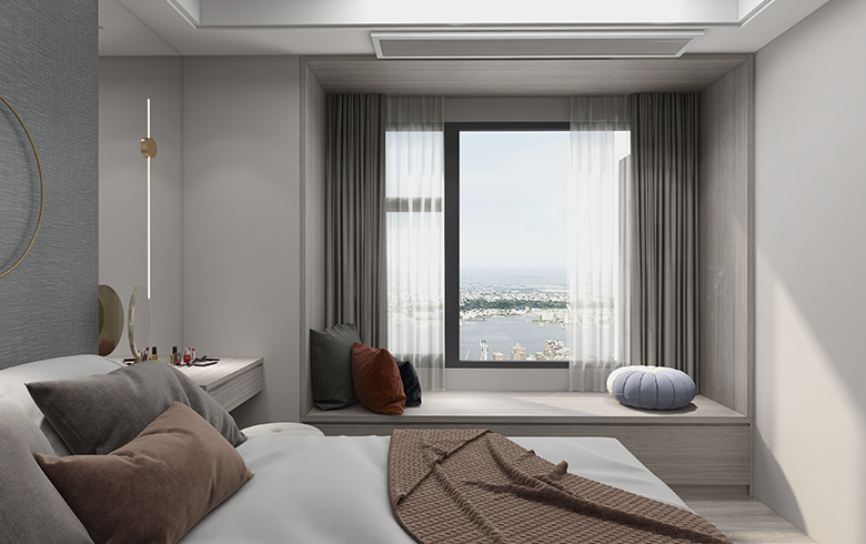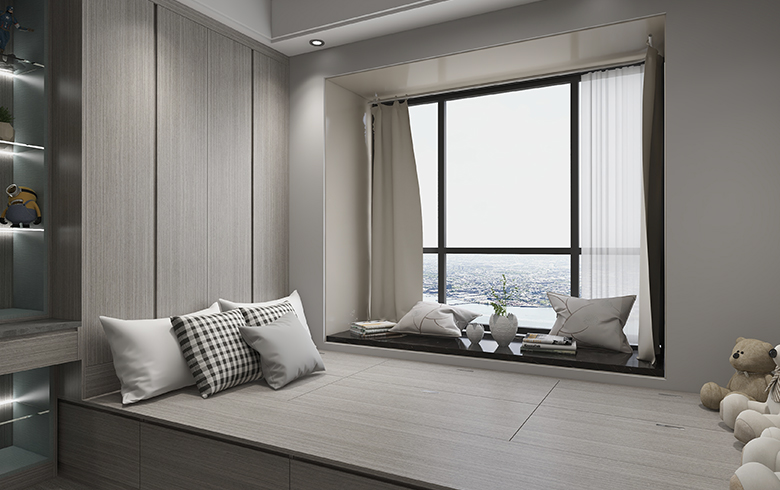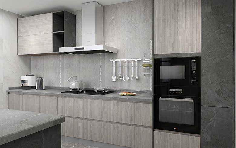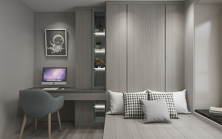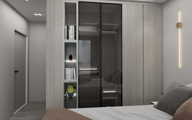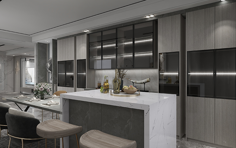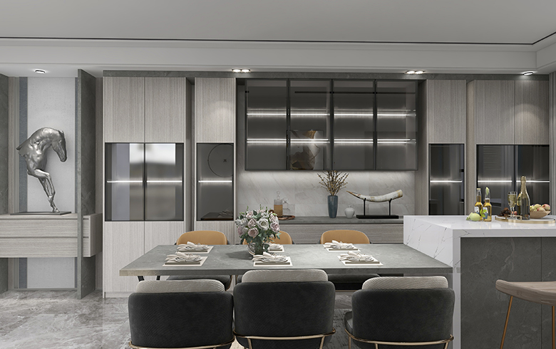 本案的簡約現代風格,擯棄所有的繁瑣,加上一些幾何圖形元素,以簡為主,將舒適清雅的氛圍裝進簡潔利落的空間。打造出一個通透明凈、清新雅致的現代空間。整個空間以暖色為基調,讓人倍感舒適溫馨,搭配淺色沙發,在定制家居中搭配黑框玻璃門及玻璃層板燈,在良好的采光下營造出透亮潔凈的視覺感受。而在空間處理上,采用開放式處理,減少空間壓抑感,同時加以深色大理石紋板材作為細致的點綴,賦予空間一抹藝術氣息。