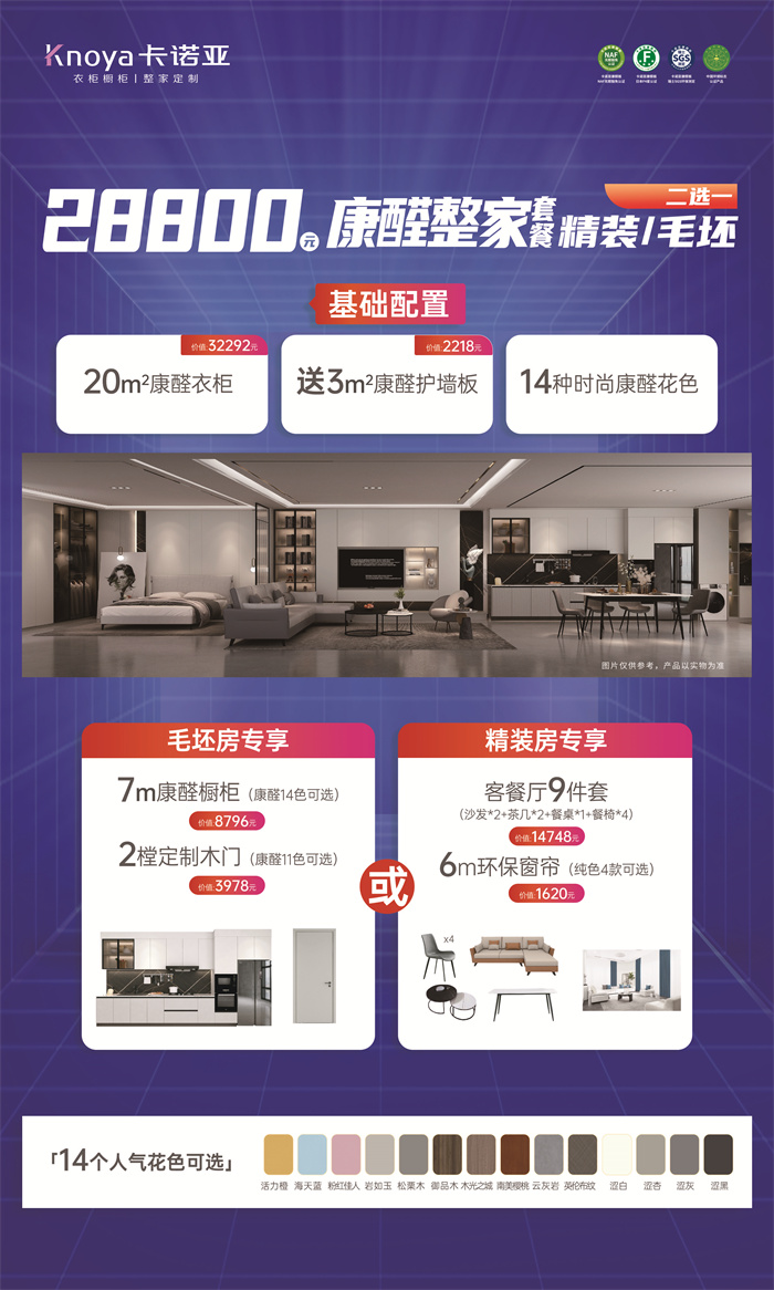 針對毛坯房,卡諾亞精準推出28800元康醛整家套餐,包括20㎡康醛定制柜+7m康醛櫥柜+2樘定制木門,送3㎡康醛背景墻;針對精裝房,卡諾亞推出28800元康醛整家套餐,包括20㎡康醛定制柜+客餐廳9件套+6m環保窗簾,送3㎡康醛背景墻。購此套餐,或下定滿30000元獨享+999元惠送卜居真皮床。