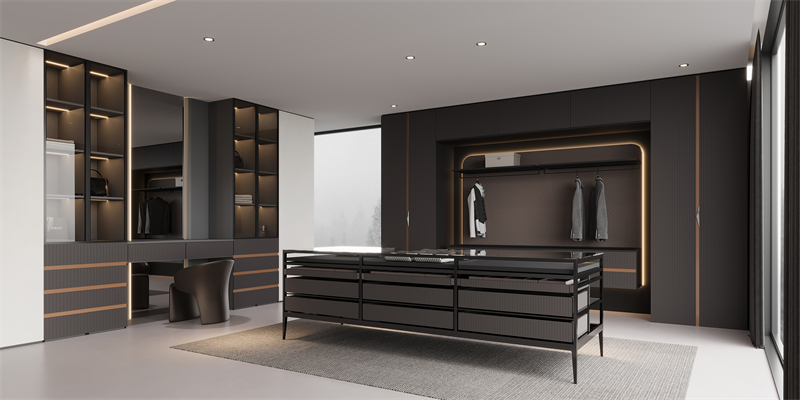 ·材質對話:直紋肌理板材與澀黑柜體形成深淺對比,數碼打印出來的紋理如大理石般通透,鋁木玻璃柜將金屬堅韌與木材溫潤完美結合。