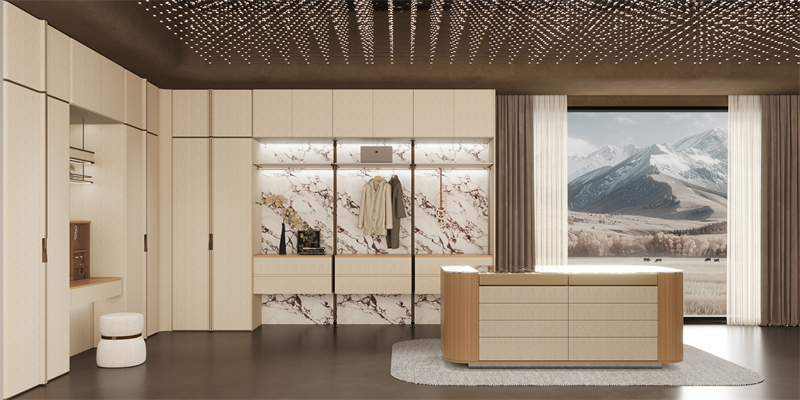 ·智能功能賦能:電動升降煙機、吊柜電動升降機等智能配件,實現隱現自如的功能美學;立柱衣帽間系統(tǒng)自帶燈光,搭配西班牙蘭伯特收納五金,奢享收納儀式感。