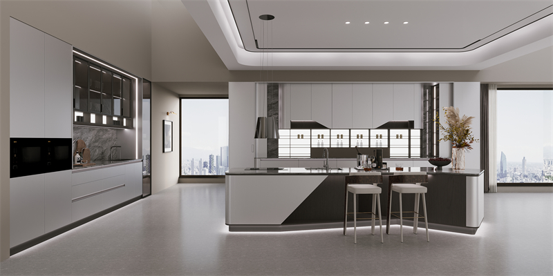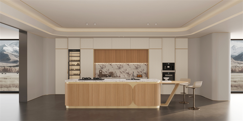 ·原創(chuàng)設計語言:源自鉆戒輪廓的門型,以戒指拉伸開的獨特輪廓融入門型設計,以左右圓弧+上下裝飾線勾勒立體層次,搭配鋅合金拉手,是功能與藝術、創(chuàng)新的完美融合;游艇造型中島臺與花瓣門板的組合,將豪華游艇的美學融入廚房空間。