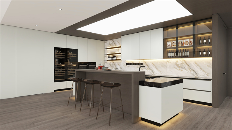 細節(jié)處亦見匠心,魔方皮紋內(nèi)嵌拉手門型搭配拉絲黑拉手,將極簡融入基因,門板與拉手渾然一體;可選配的海蒂詩、百隆等進口鉸鏈,讓每一次開合都安靜順滑,這份 “看不見的用心” 正是其 “懂設(shè)計” 的底氣。