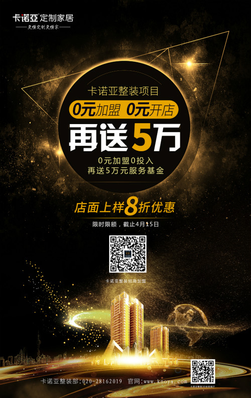加盟卡諾亞整裝重磅喜訊來(lái)了:0元加盟,再送5萬(wàn)元服務(wù)基金,享受店面上樣8折優(yōu)惠,政策僅限簽約前20名,截止4月15日。
