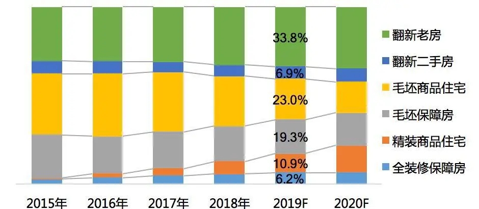 事實(shí)上,趨勢早已顯現(xiàn)。權(quán)威調(diào)研數(shù)據(jù)顯示,從住宅裝修市場的產(chǎn)值結(jié)構(gòu)來看,老房及二手房翻新市場在2019年合計(jì)占比超過40%,2020年將超過42%。而毛坯商品住宅市場的比重持續(xù)下降,2019年預(yù)計(jì)略低于23%,2020年可降至17.6%,毛坯房市場在2020年也將低于37%。由此,存量房翻新超過毛坯房市場產(chǎn)值規(guī)模的時(shí)代將繼續(xù)深化。