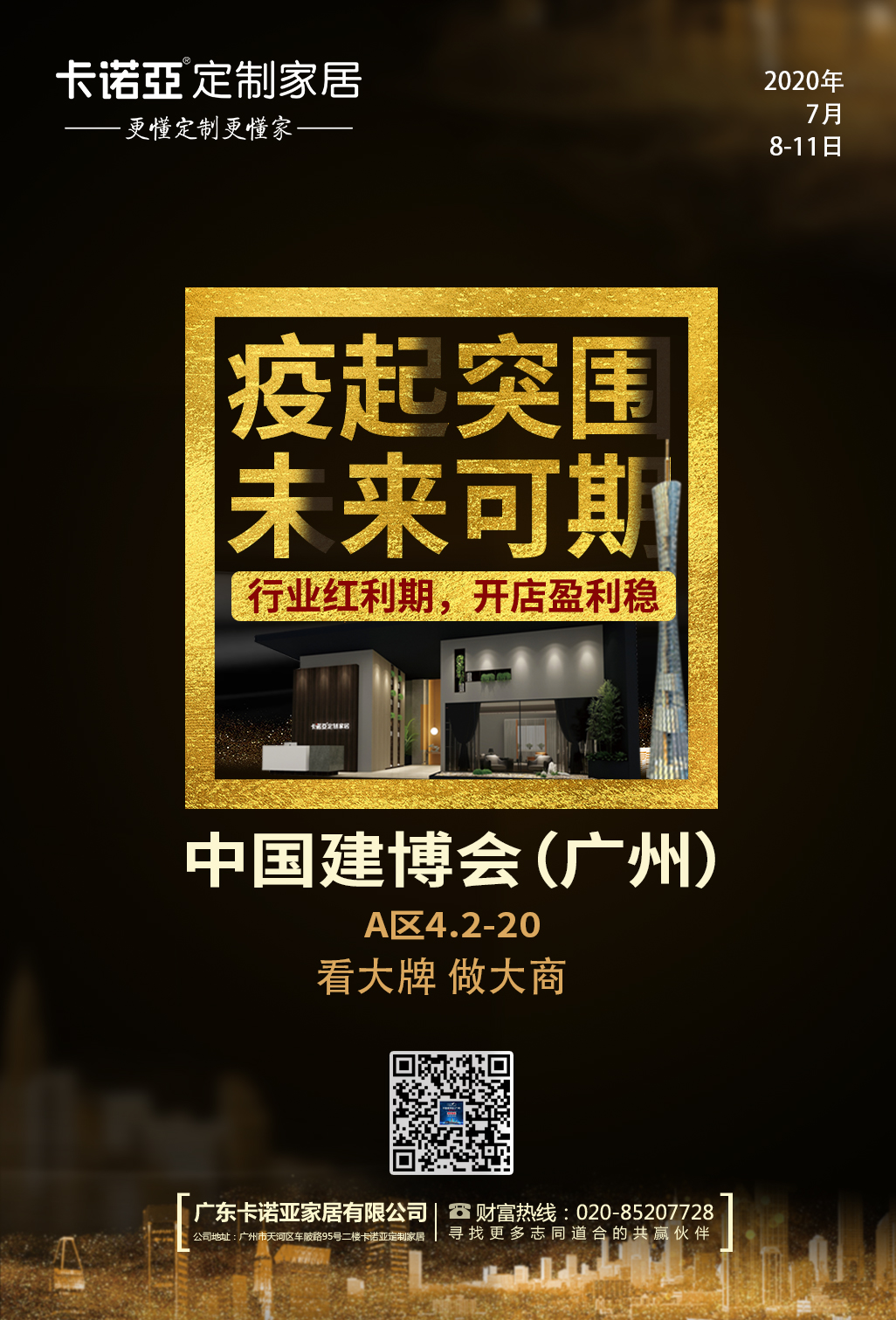 卡諾亞作為一家充滿朝氣的品牌,處于求賢若渴階段,任何愿意上進的投資者,都會是卡諾亞的座上賓,有幸加入卡諾亞,公司專業招商團隊,將會對你在這個行業的創業提供多對一的幫扶,因為卡諾亞更懂定制更賺錢,更懂得如何培育百萬、千萬大商。看大牌、做大商,請7月8-11日親臨廣州建博會卡諾亞展館A區4.2-20,零距離體驗大牌魅力。