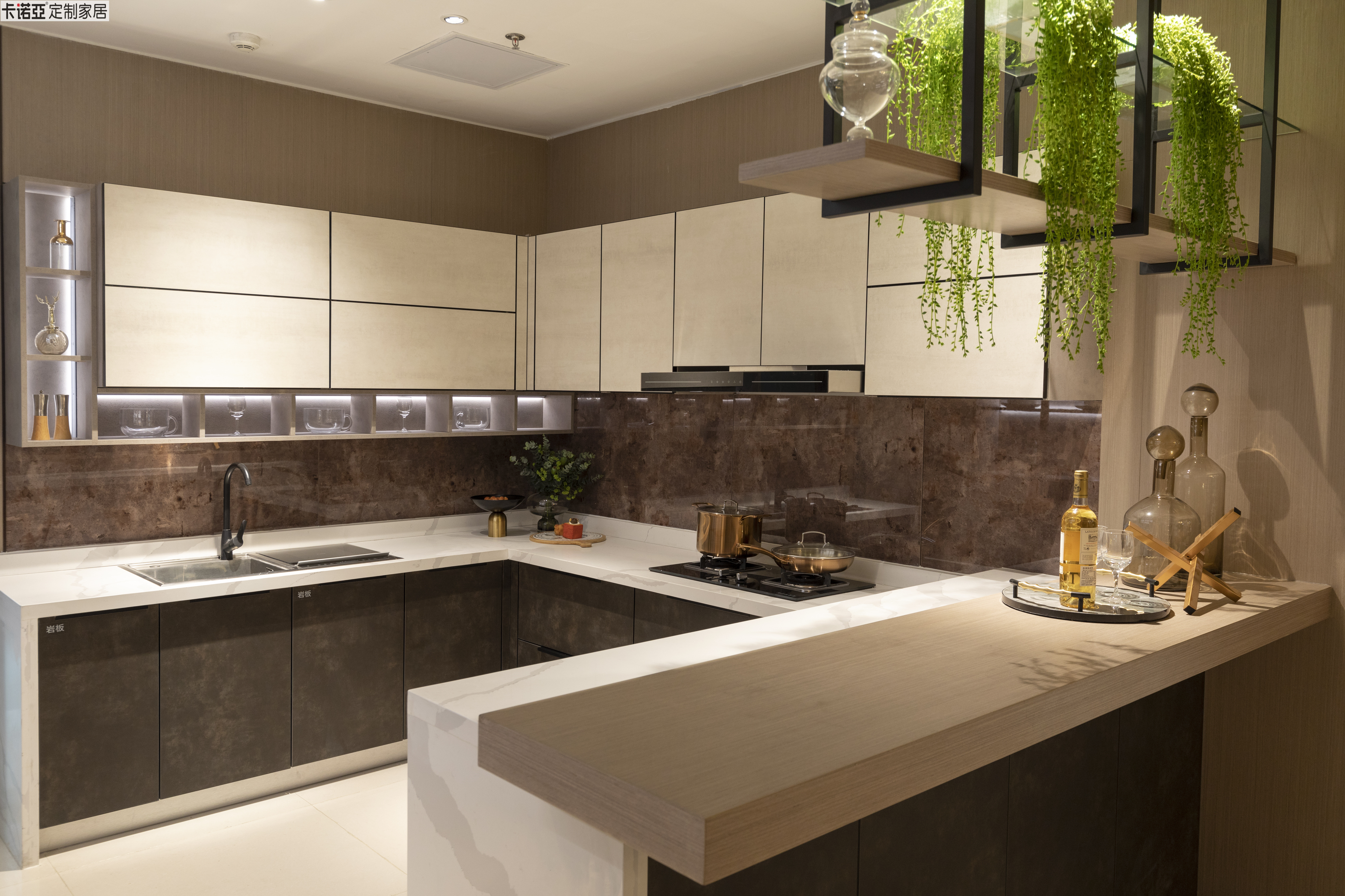 作為廚房重要的區(qū)域,巖板除了能應(yīng)用在廚房空間的整體建筑材料以外,還能應(yīng)用于灶臺(tái)臺(tái)面的飾面建材,由于其致密度高,莫氏硬度達(dá)到9級(jí),易打理、空間大、不留菌、不發(fā)霉、耐腐蝕、耐高溫等優(yōu)越性能,深受定制家居的消費(fèi)者青睞。