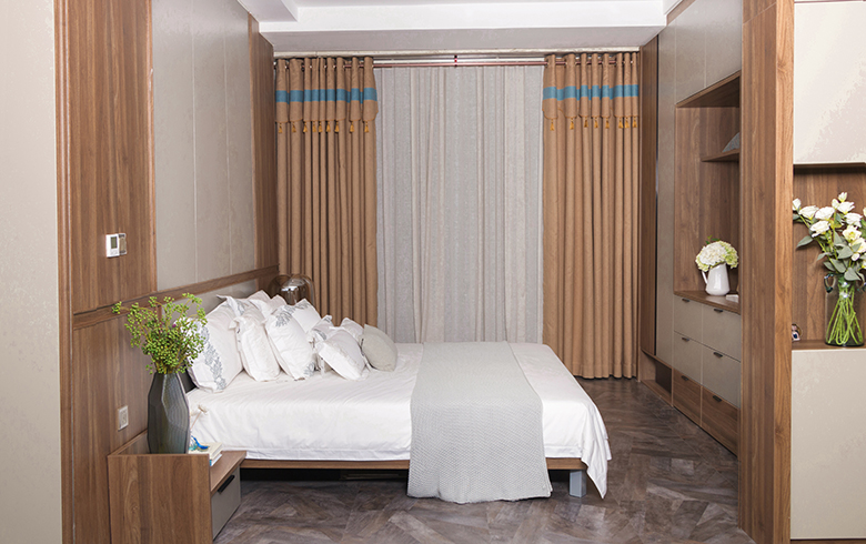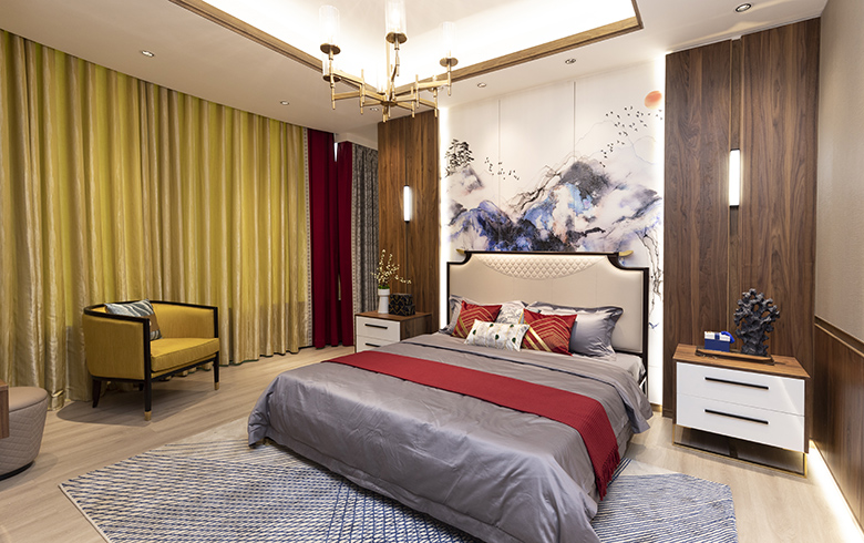 卡諾亞丨東方雅閣·臥房采用隔斷柜隔開主臥和衣帽間功能區(qū),相對獨立、互不干擾,一邊是全身試衣鏡,一邊是梳妝臺,中式屏風(fēng)點綴,讓隔斷柜成為臥房一道靚麗的風(fēng)景線。歐式墻裙、中式臥榻、床頭3D中式山水裝飾畫、皇家黃與中國紅搭配的窗簾、對稱均衡的設(shè)計,讓臥房別具東方人文氣質(zhì)。