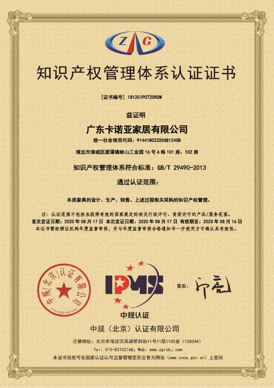 近日,經層層嚴格的內審、外審,作為高新技術企業的卡諾亞,順利通過中規(北京)認證有限公司的審核,其知識產權管理體系完全符合國家關于企業知識產權管理規范的要求。獲此認證,表明卡諾亞在推進公司知識產權管理規范化方面獲得重要認可,綜合競爭力進一步提升,對企業健康可持續發展帶來深遠影響,也為中國定制家居行業推進知識產權管理體系建設樹立了標桿。