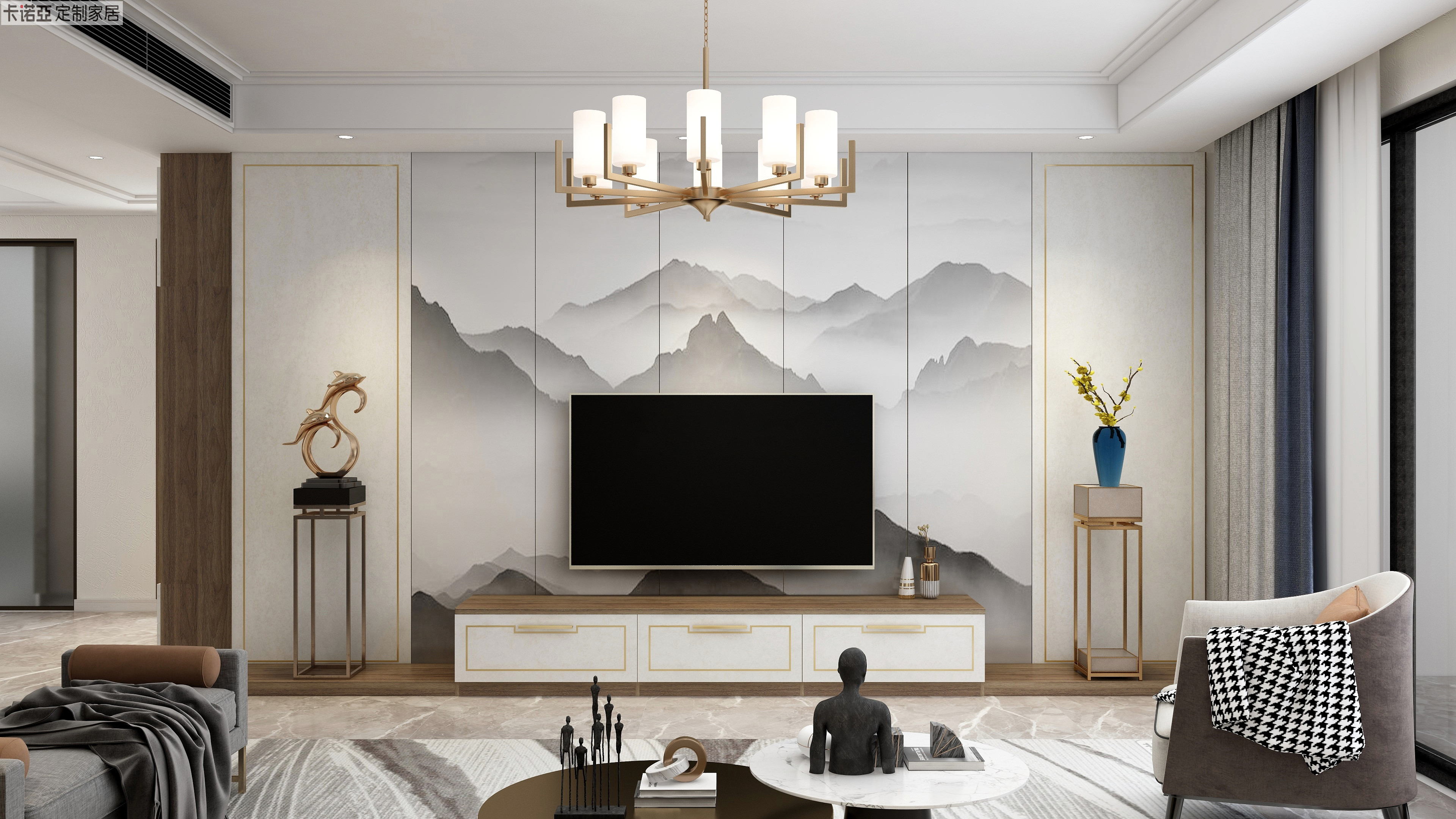 3D中式山水畫作為電視背景墻,讓人耳目一新。搭配側邊對稱的護墻板,采用回紋型金屬條的金邊勾勒,于無聲處驚鴻一瞥,營造意境悠遠的東方禪意空間。