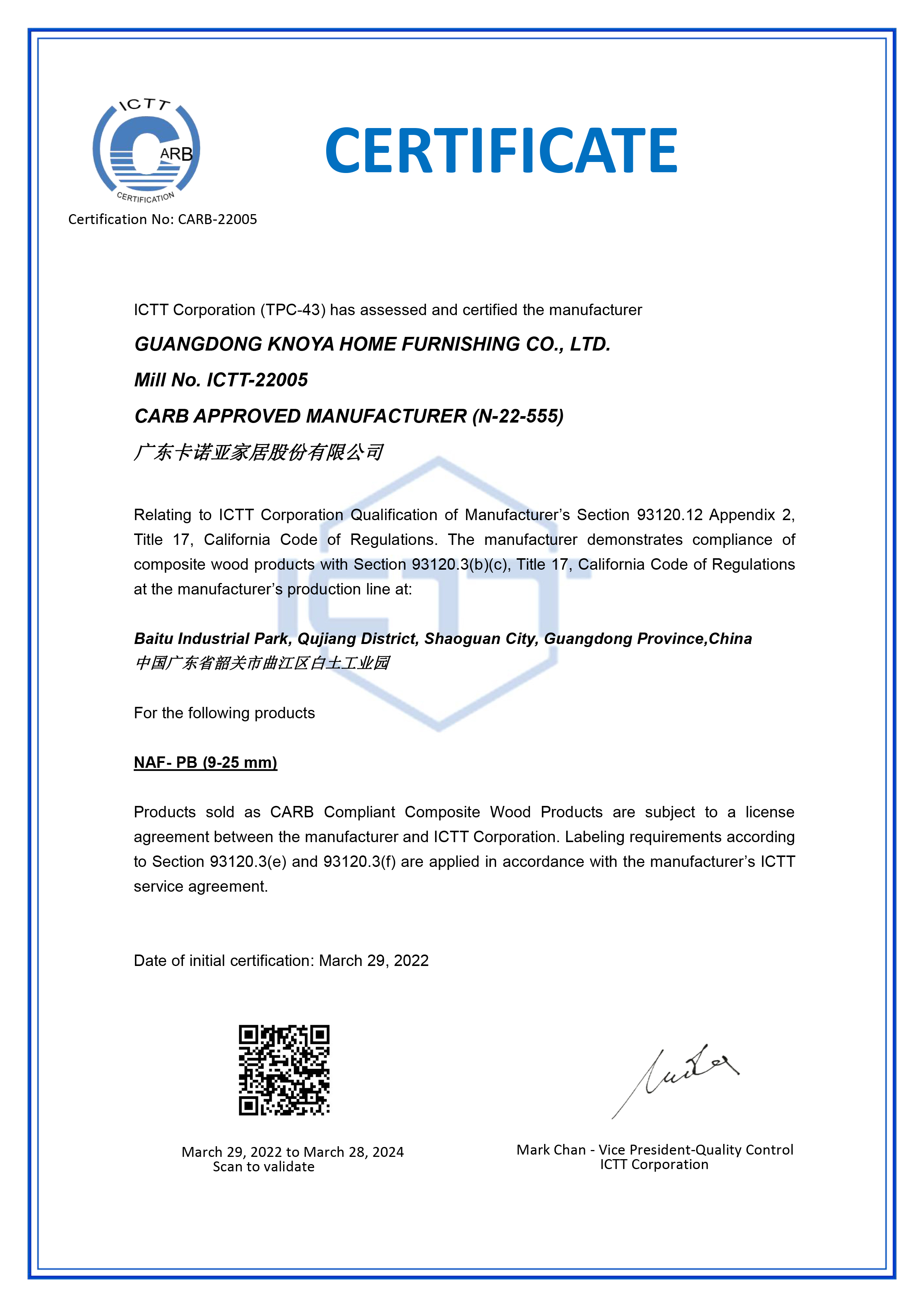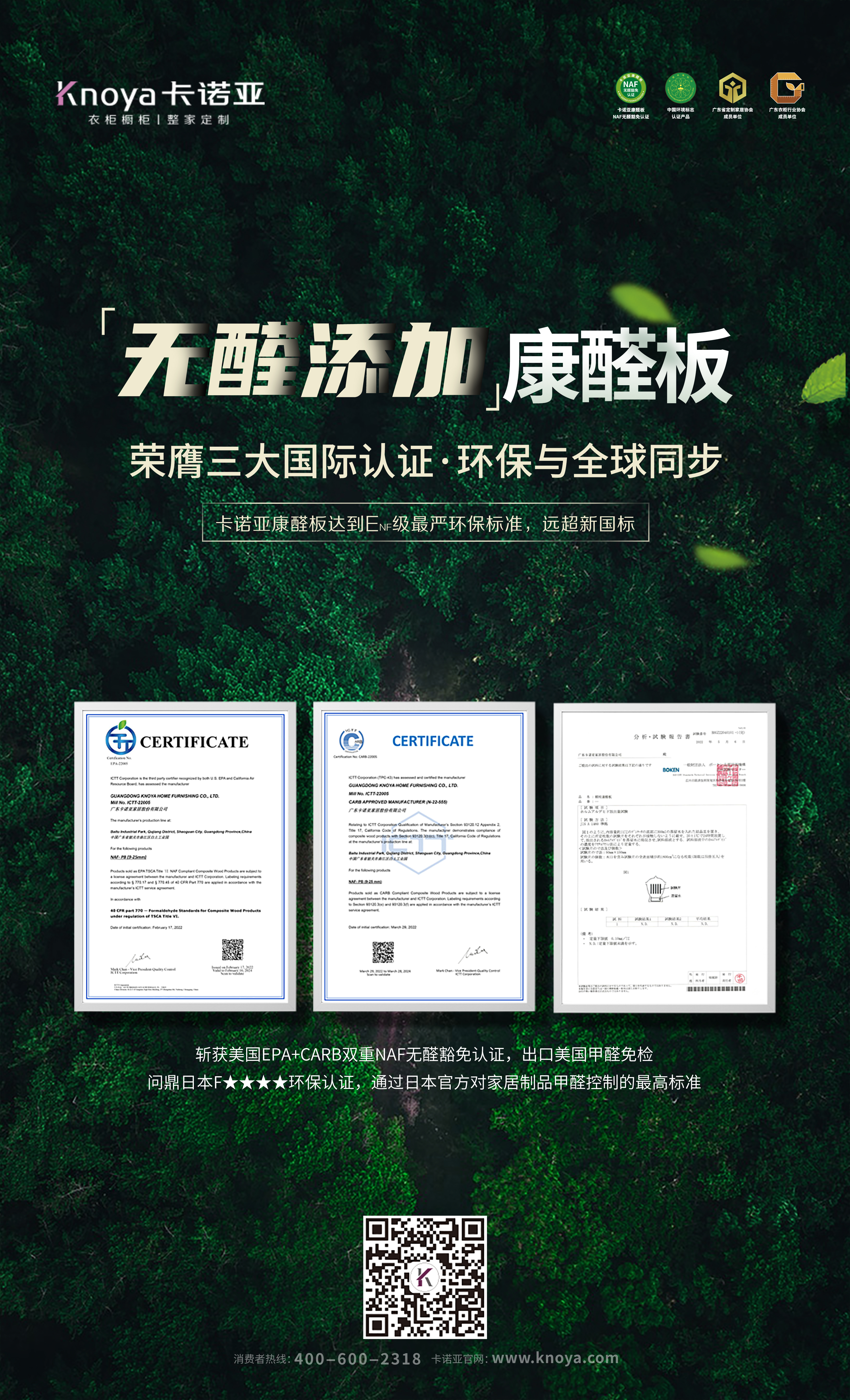 2022年3月,卡諾亞康醛板獲得全球至高級別的美國CARB-NAF無醛豁免認證、美國EPA-NAF無醛豁免認證。同年5月,卡諾亞再次突破環保標準新高度,獲得由日本國土交通省頒發的F★★★★認證證書。