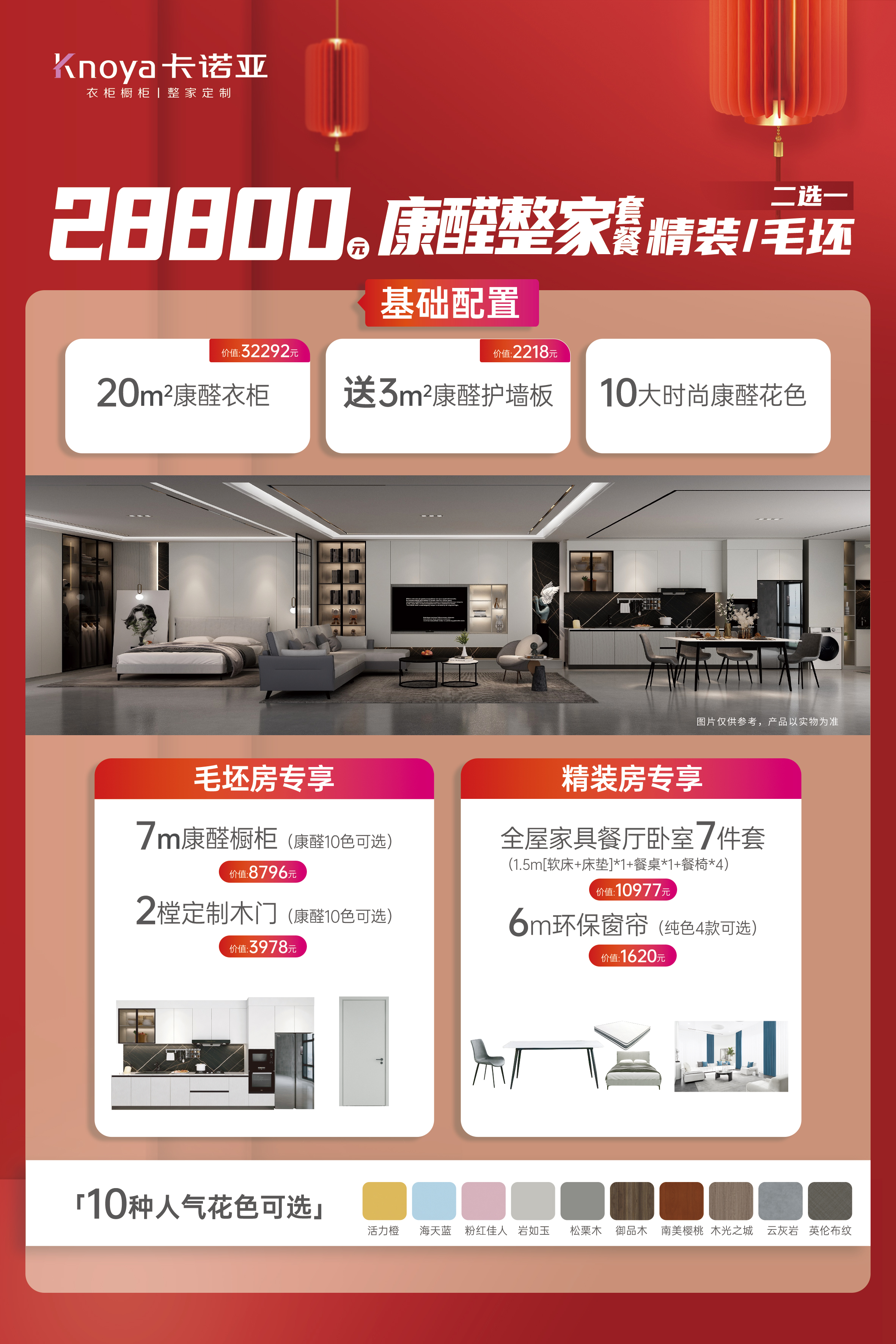 28800元康醛整家套餐=20㎡康醛定制柜+7m康醛櫥柜+2樘定制木門(毛坯房)或20㎡康醛定制柜+餐廳臥室7件套+6m窗簾(精裝房),再送3㎡背景墻,全屋標(biāo)配康醛板,花色再次升級(jí)為10大人氣花色,一個(gè)套餐就能將柜、墻、門等產(chǎn)品一站配齊,真正實(shí)現(xiàn)“一家搞定,拎包入住,省錢省心”。