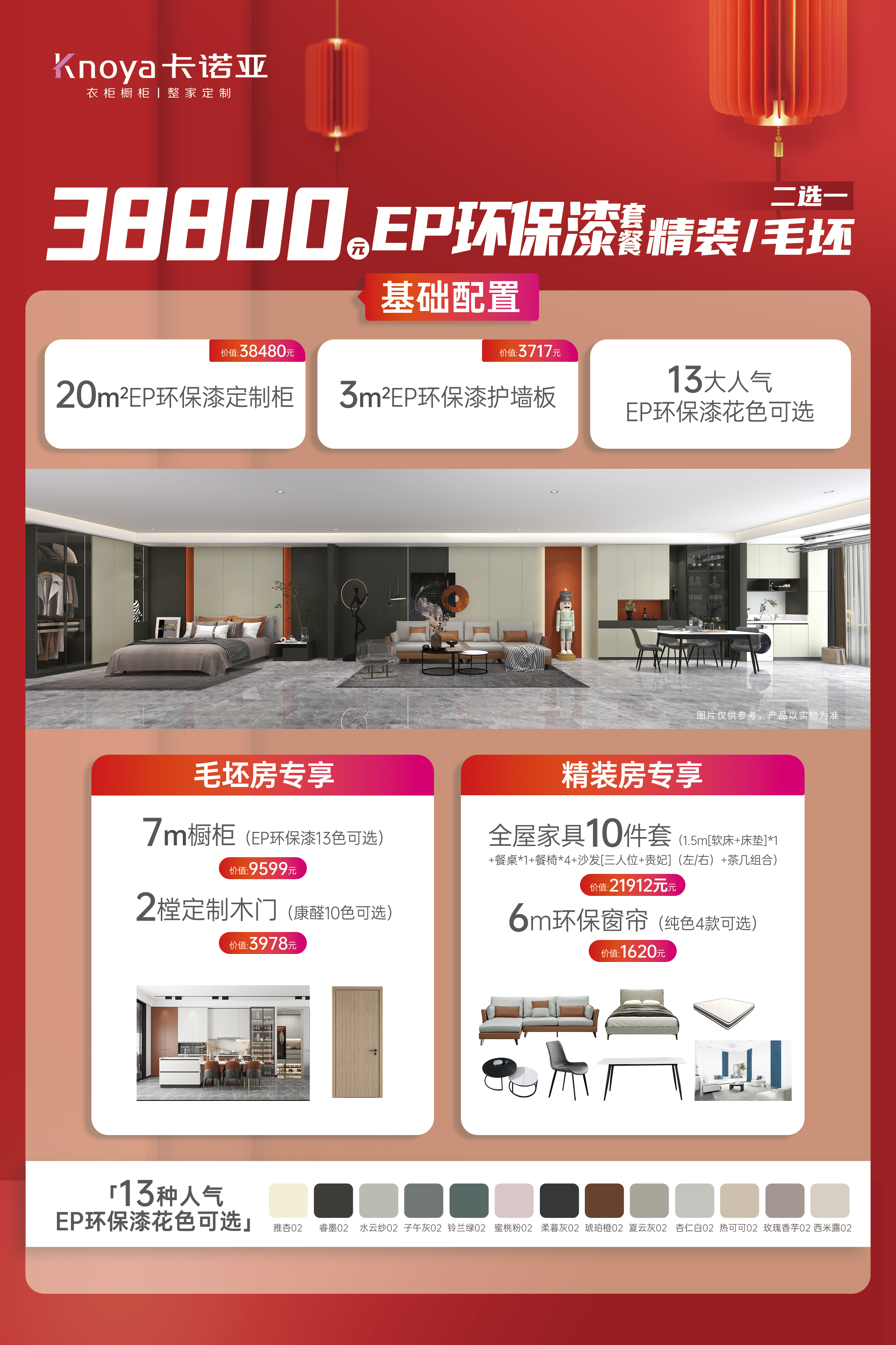 本次大促,除了一直在推出的28800元康醛整家套餐,還重磅推出了38800元EP環(huán)保漆整家套餐,分別針對(duì)毛坯房和精裝房配置了不同的套餐內(nèi)容,買套餐再送3㎡背景墻,并且將柜墻門一體化理念貫穿到整家套餐之中,讓消費(fèi)者買得實(shí)惠、裝得省心、住得舒適!